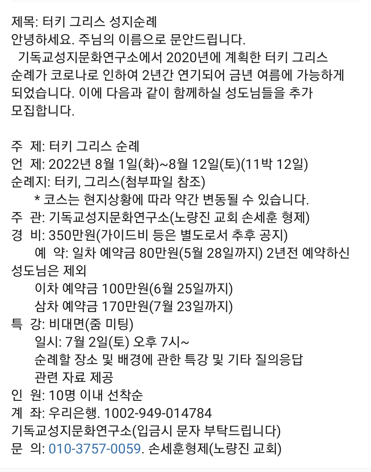 기독교성지문화연구소(입금시 문자 부탁드립니다)
