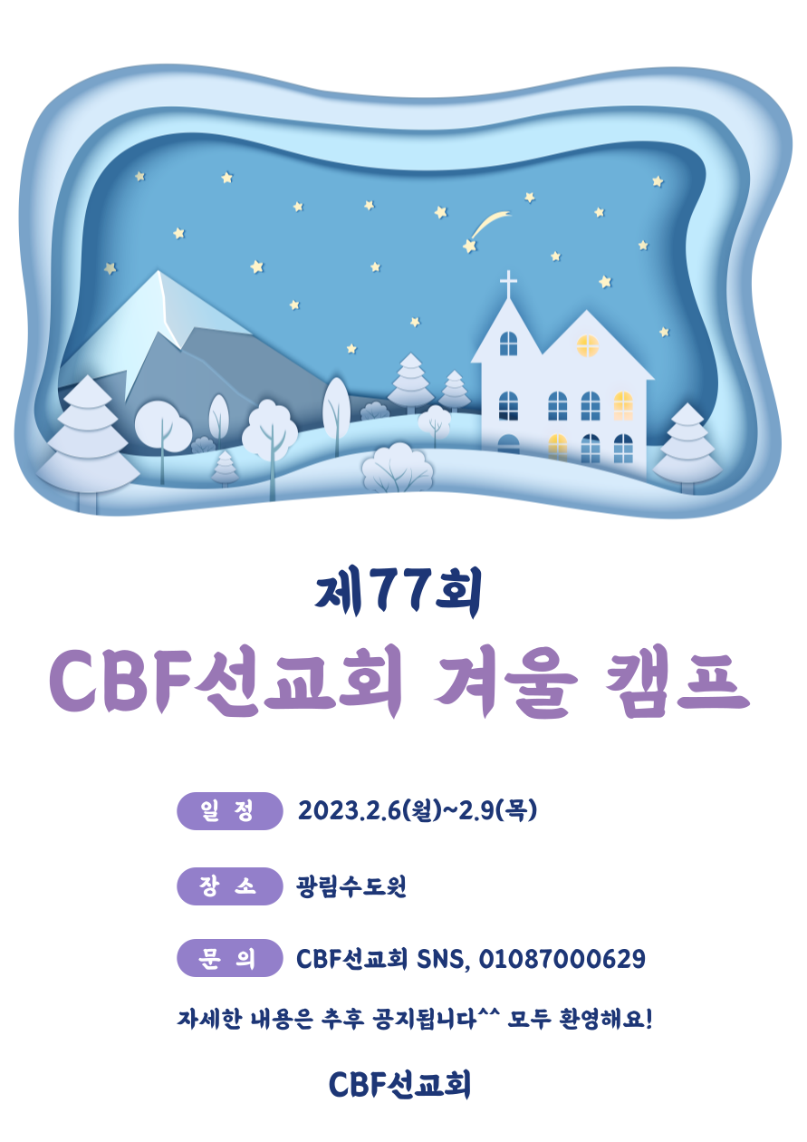 제77회 CBF선교회 겨울캠프가 2월6일~9일까지 3박4일간 광림수도원에서 진행됩니다. 자세한 내용은 추후공지예정입니다. 캠프를 위해 많은 참여와 기도를 부탁드립니다.