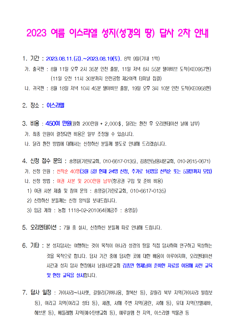[캠프와 수련회] 2023년 여름 이스라엘 성지답사 2차 안내