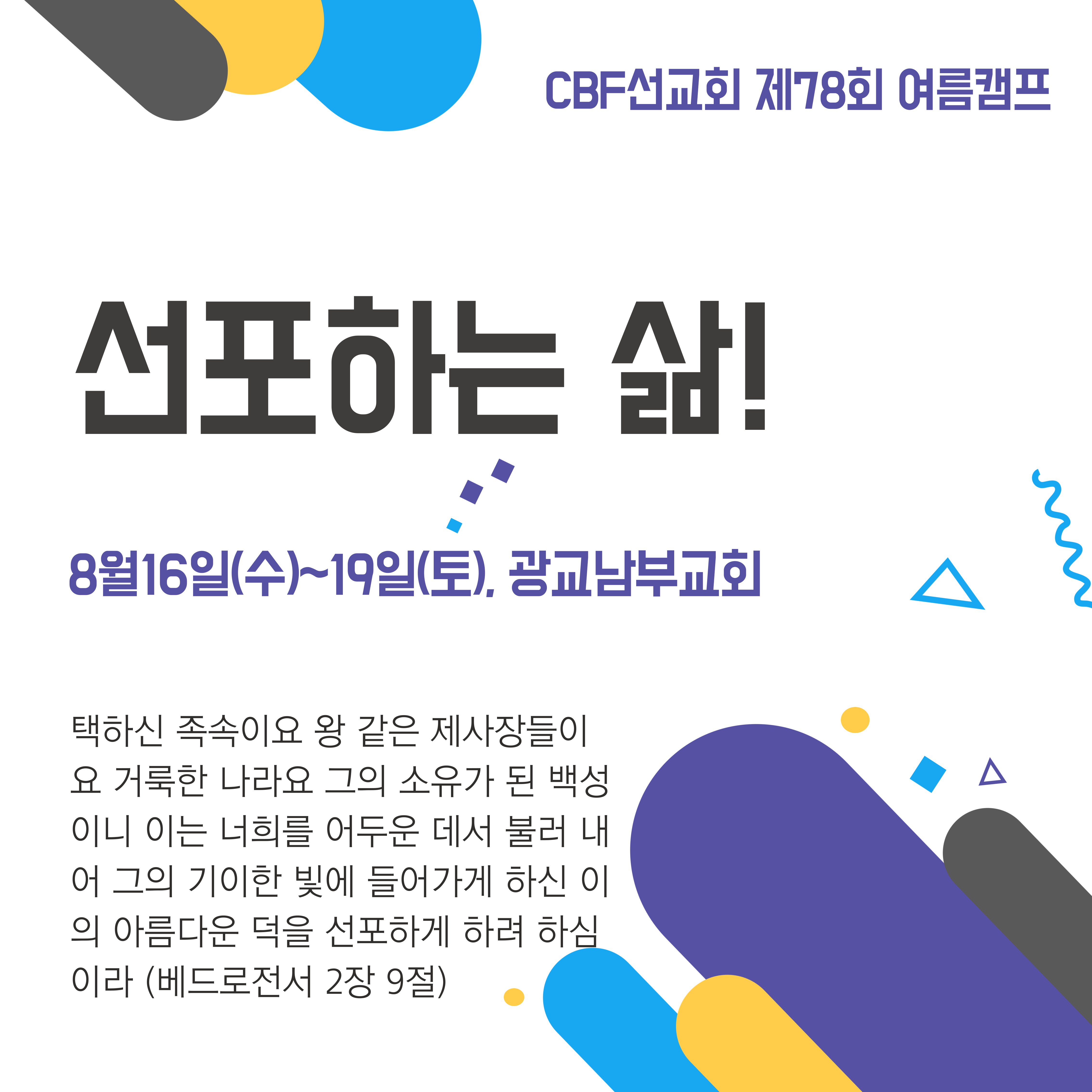 제78회 CBF선교회 여름캠프가 광교남부교회(경기 용인시 기흥구 흥덕2로87번길 18 D동 4층)에서 3박4일간 진행됩니다.
