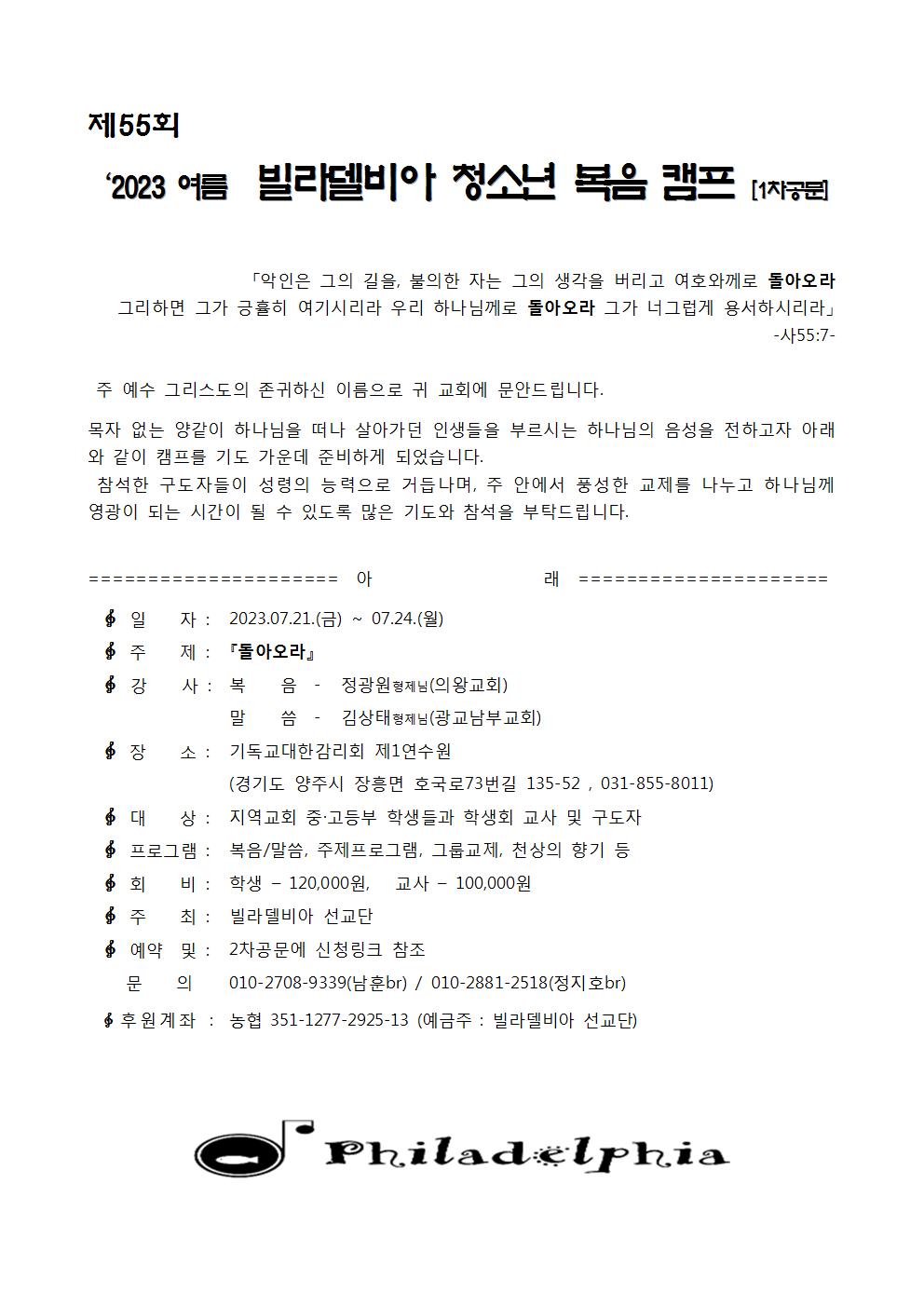 [캠프와 수련회] 2023여름 제55회 빌라델비아 청소년 복음 캠프[1차공문]