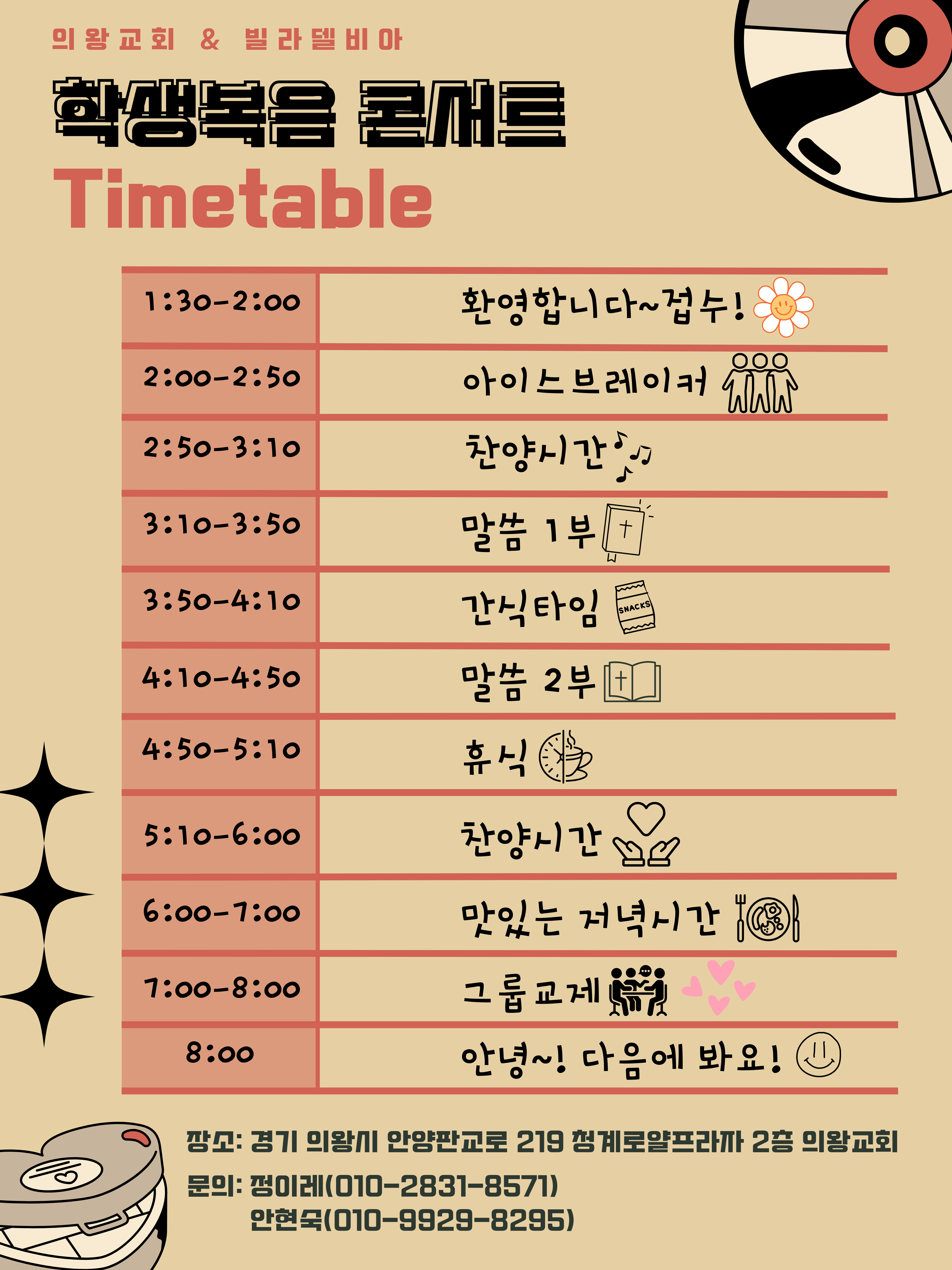 기타 자세한 일정은 포스터 참고해 주시기 바라며, 많은 학생들이 참석해서 복음을 들을 수 있도록 관심과 기도를 부탁드립니다.