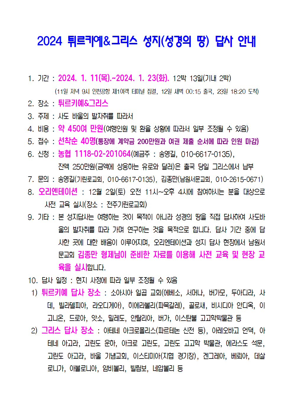 2024년 튀르키예(터키)-그리스 성지답사 일정이 위와같이 결정되었습니다. 함께 하시기 희망하시는 분들은 위 연락처로 문자를 주시면 신청양식 보내드리겠습니다.