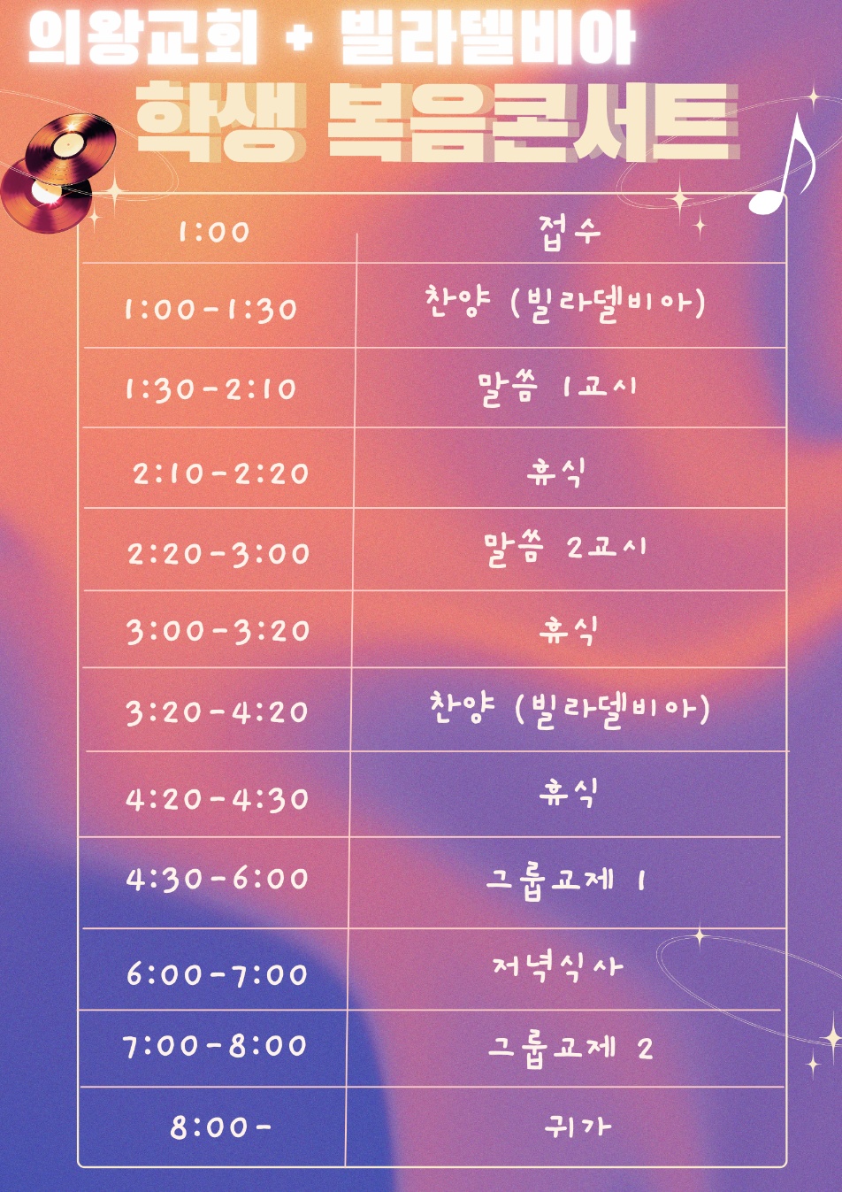 기타 자세한 일정은 포스터 참고해 주시기 바라며, 많은 학생들이 참석해서 복음을 들을 수 있도록 관심과 기도를 부탁드립니다.