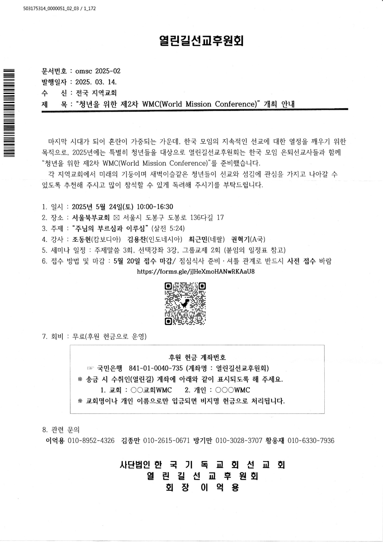 [강습과 세미나] 청년을 위한 제 2차 WMC ( 5월 24일)