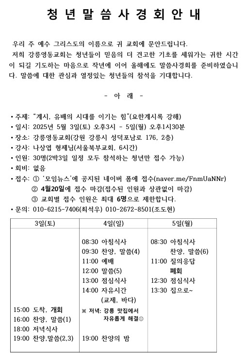 청년말씀사경회에 청년들을 초대합니다. 접수: https://naver.me/FnmUaNNr(4월20일 접수마감) ∗ 공문은 첨부된 파일로 대신합니다.
