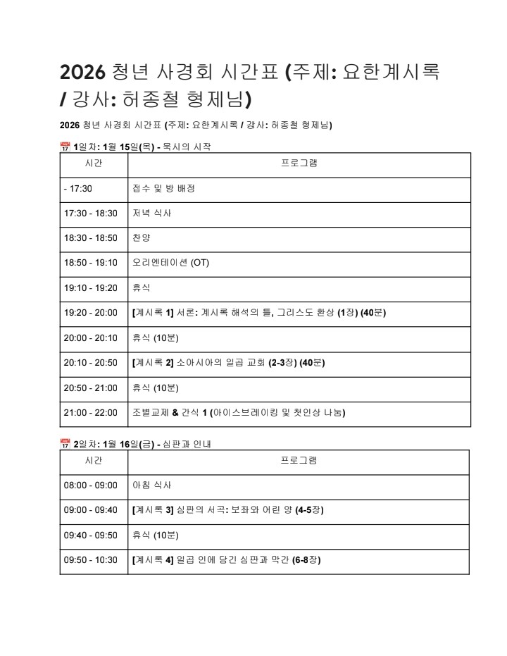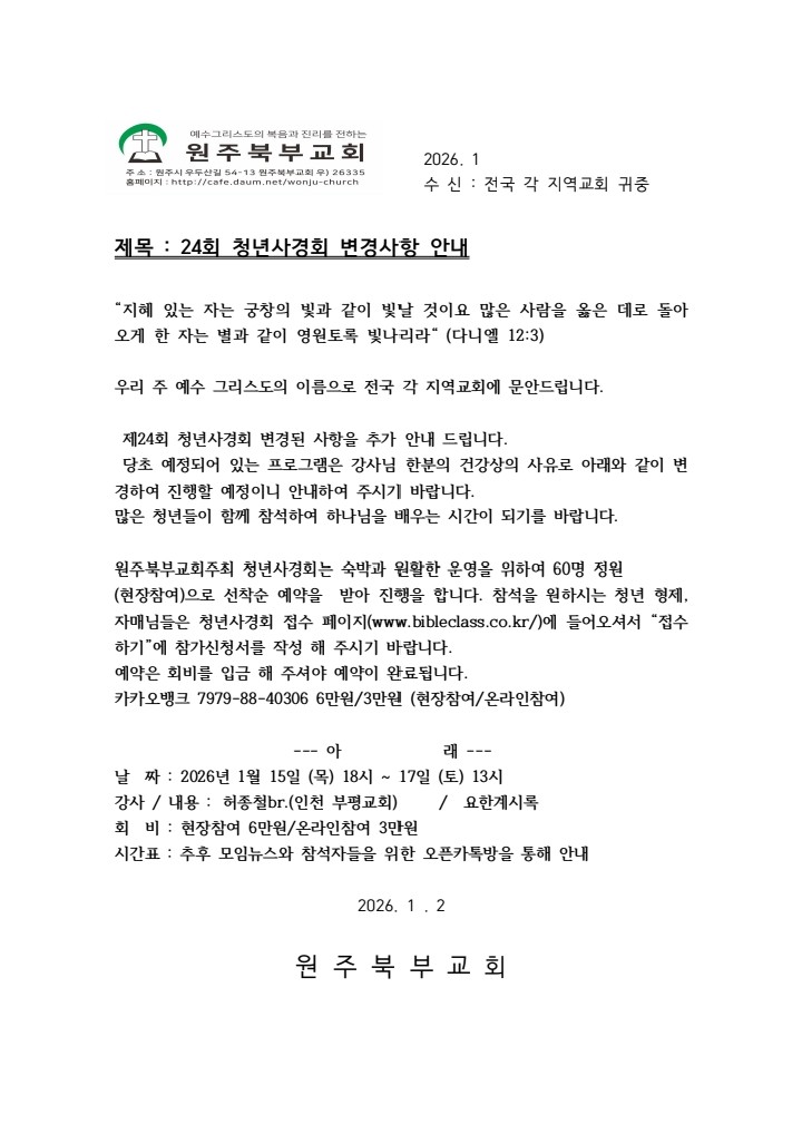 [캠프와 수련회] 청년사경회 강사 변경 건 (1월 15-17일)