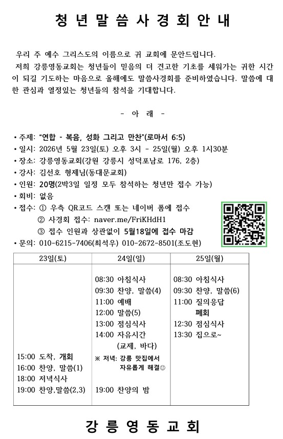 말씀을 사모하는 청년들을 청년말씀사경회에 초대합니다. 접수: https://naver.me/FriKHdH1