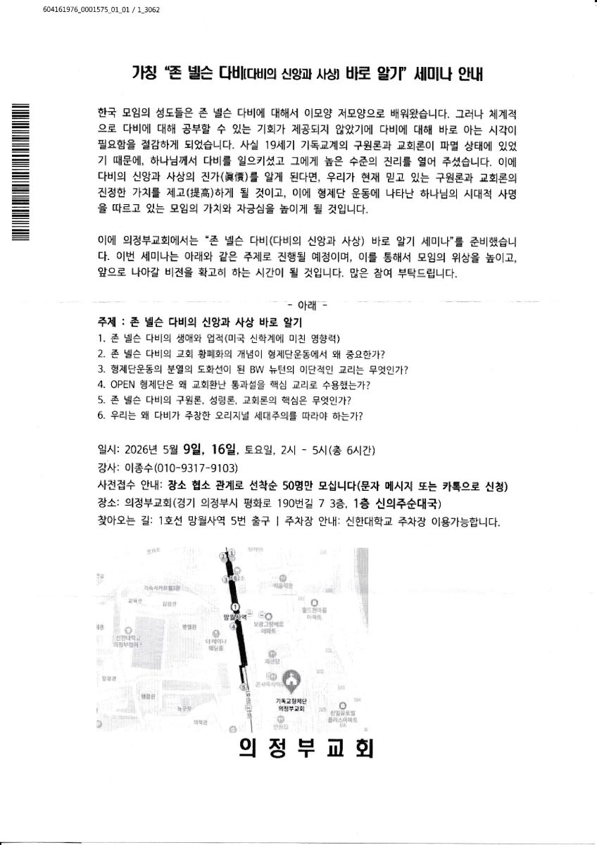 [강습과 세미나] 가칭 "존 넬슨 다비의 신앙과 사상 바로 알기" 세미나 (5월 9, 16일)