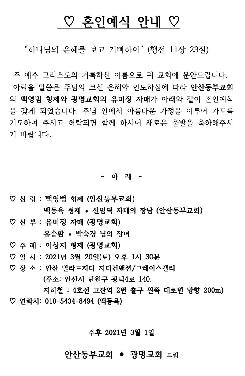 [기쁜소식] 백영범형제, 유미정자매(3월 20일)