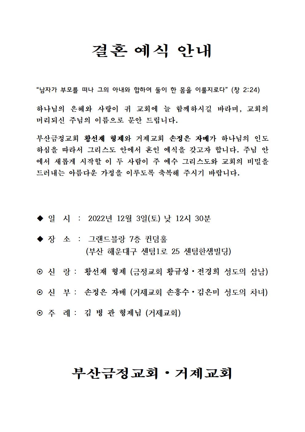[기쁜소식] 황선재 형제, 손정은 자매(12월 3일)