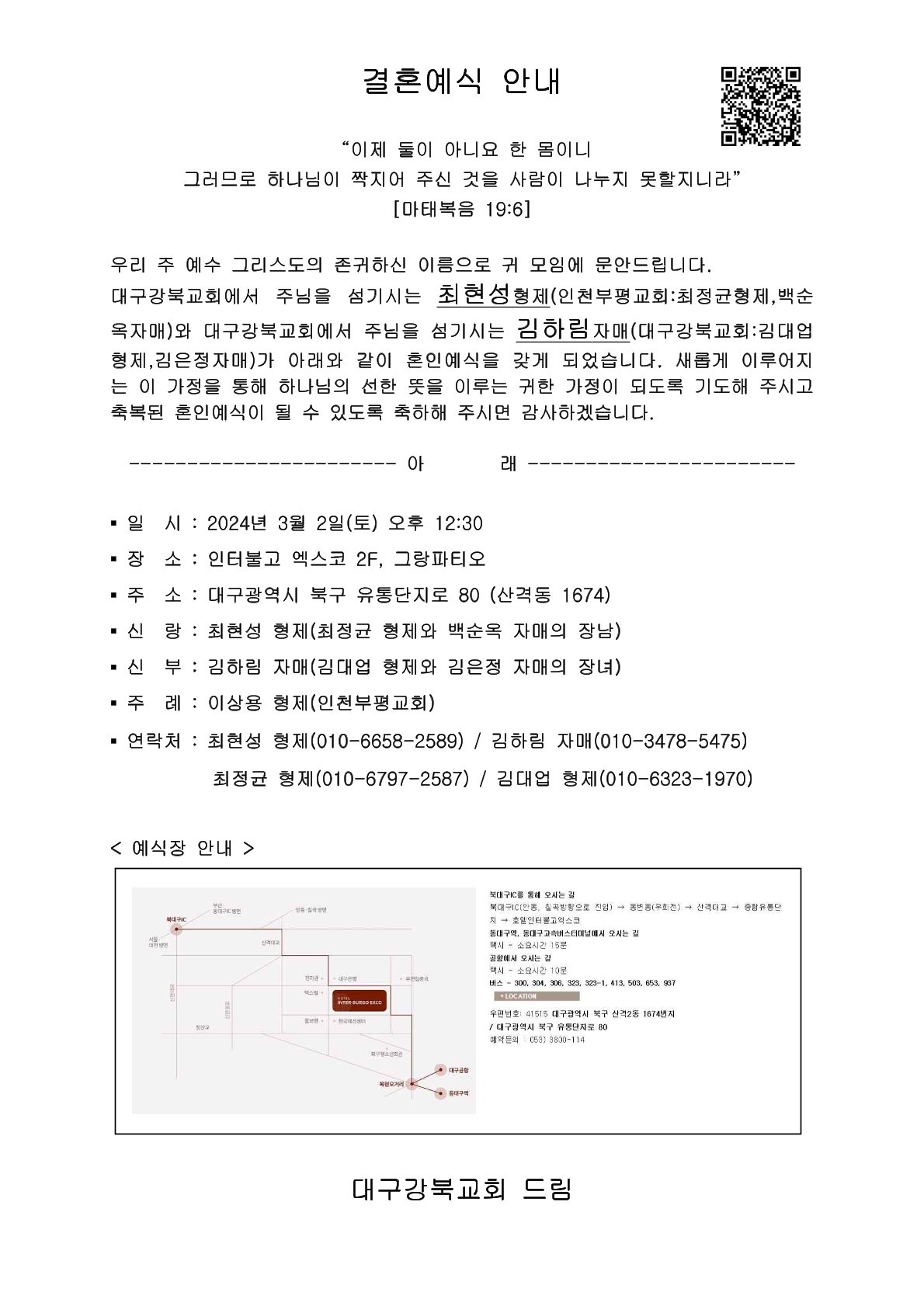 - 신부 : 김하림sr(대구강북교회) - 김대업br, 김은정sr의 장녀