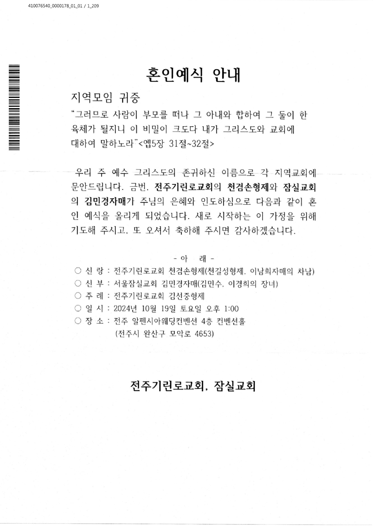 [기쁜소식] 천겸손형제, 김민경자매 (10월 19일)