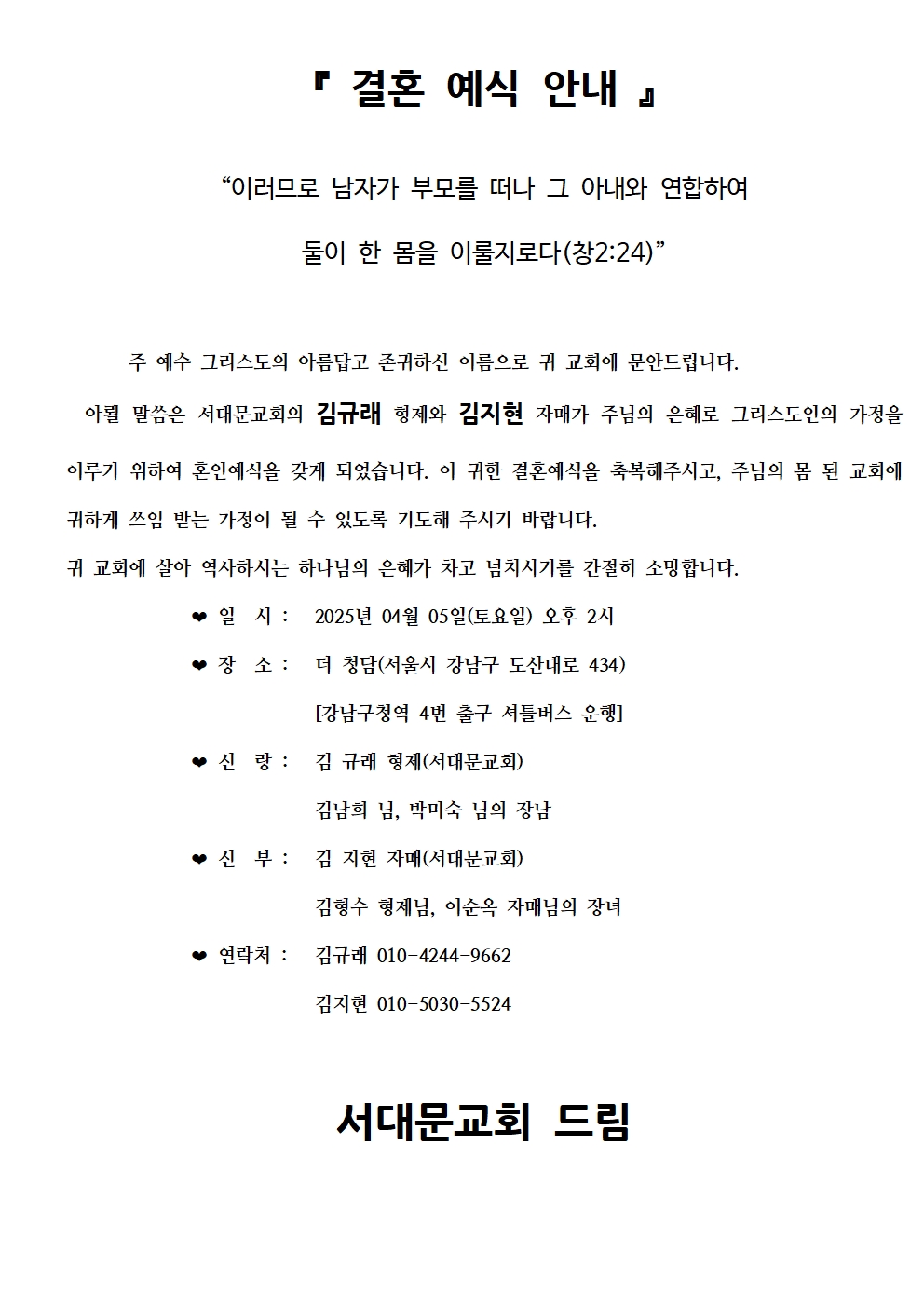 [기쁜소식] 김규래,김지현 04.05.(토) 2시 서대문교회