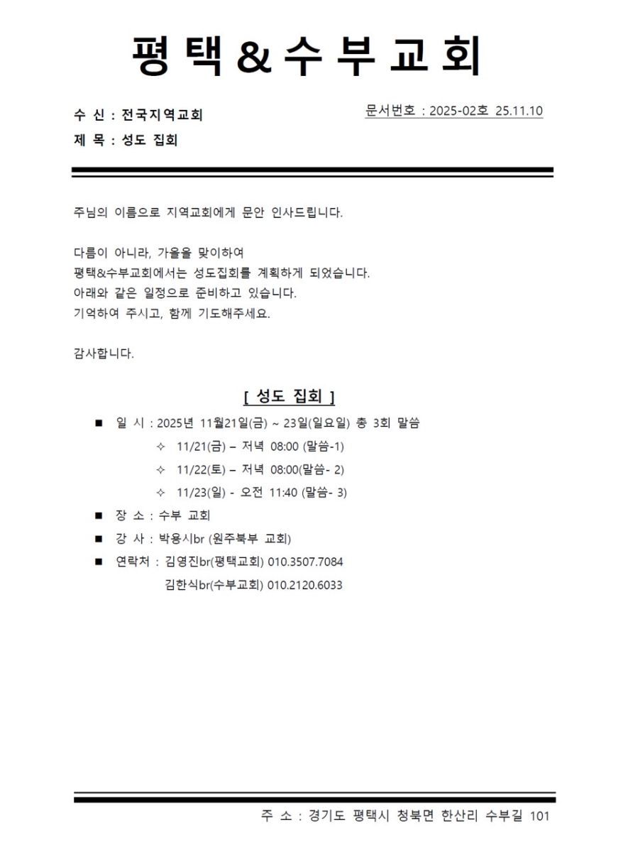 [성도집회] 평택&수부교회 (11월 21-23일)