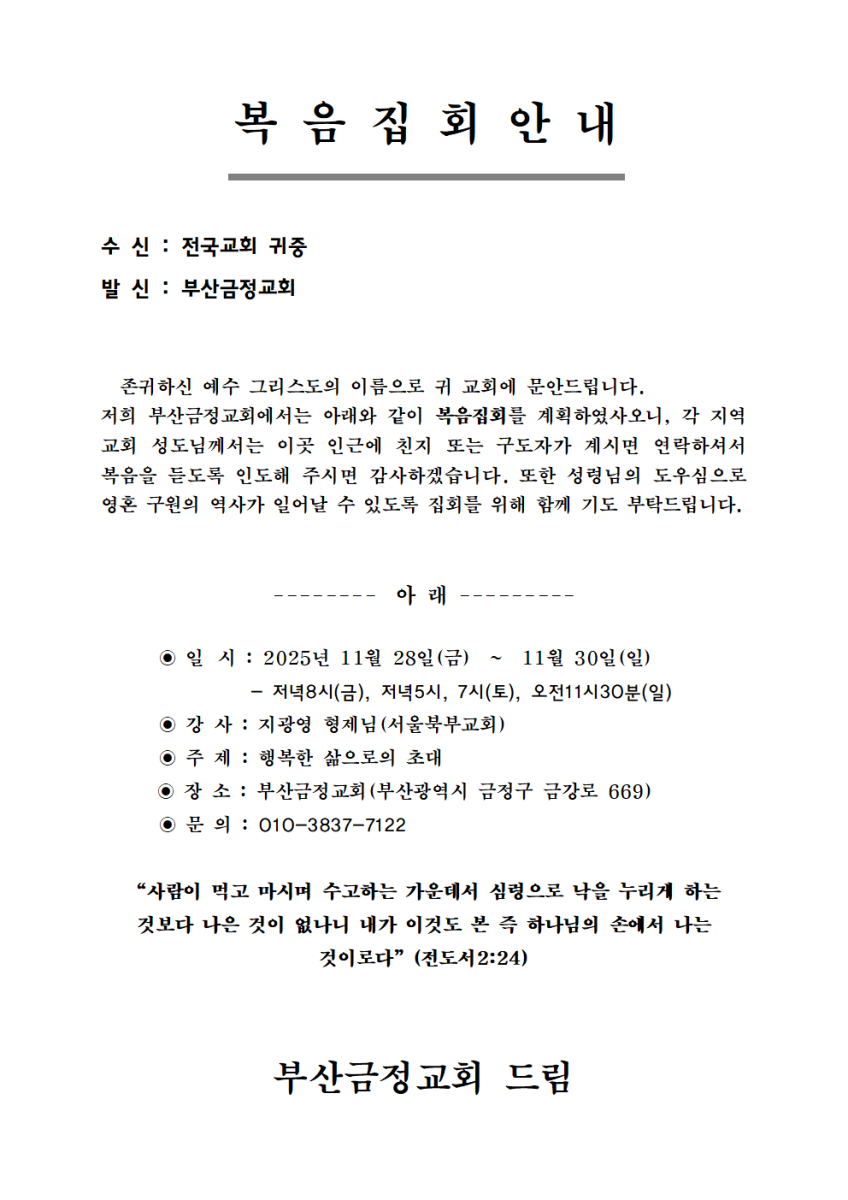 [복음집회] 부산금정교회 복음집회 안내(11월 28-30일)