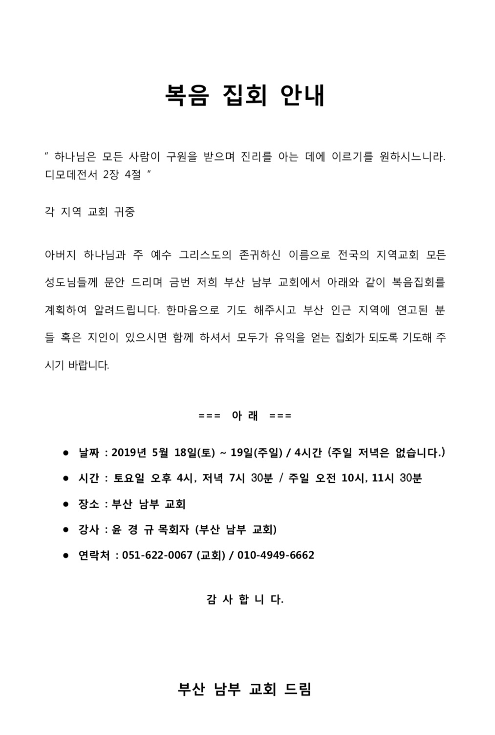 [복음집회] 부산남부교회(5월18~19일)
