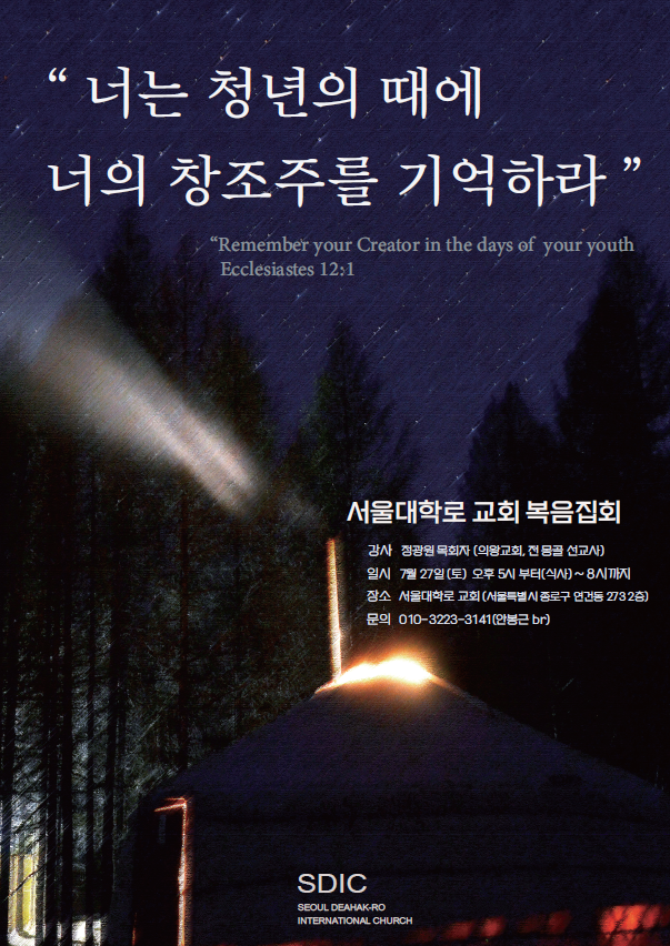 일시 : 2024년 7월 27일(토) 오후 5시 ~ 8시 강사 : 정광원 형제님(의왕교회) 장소 : 서울대학로교회 주소 : 서울시 종로구 율곡로13길 16 쿨시스템빌딩(2층~4층) 연락처 : 010-3223-3141
