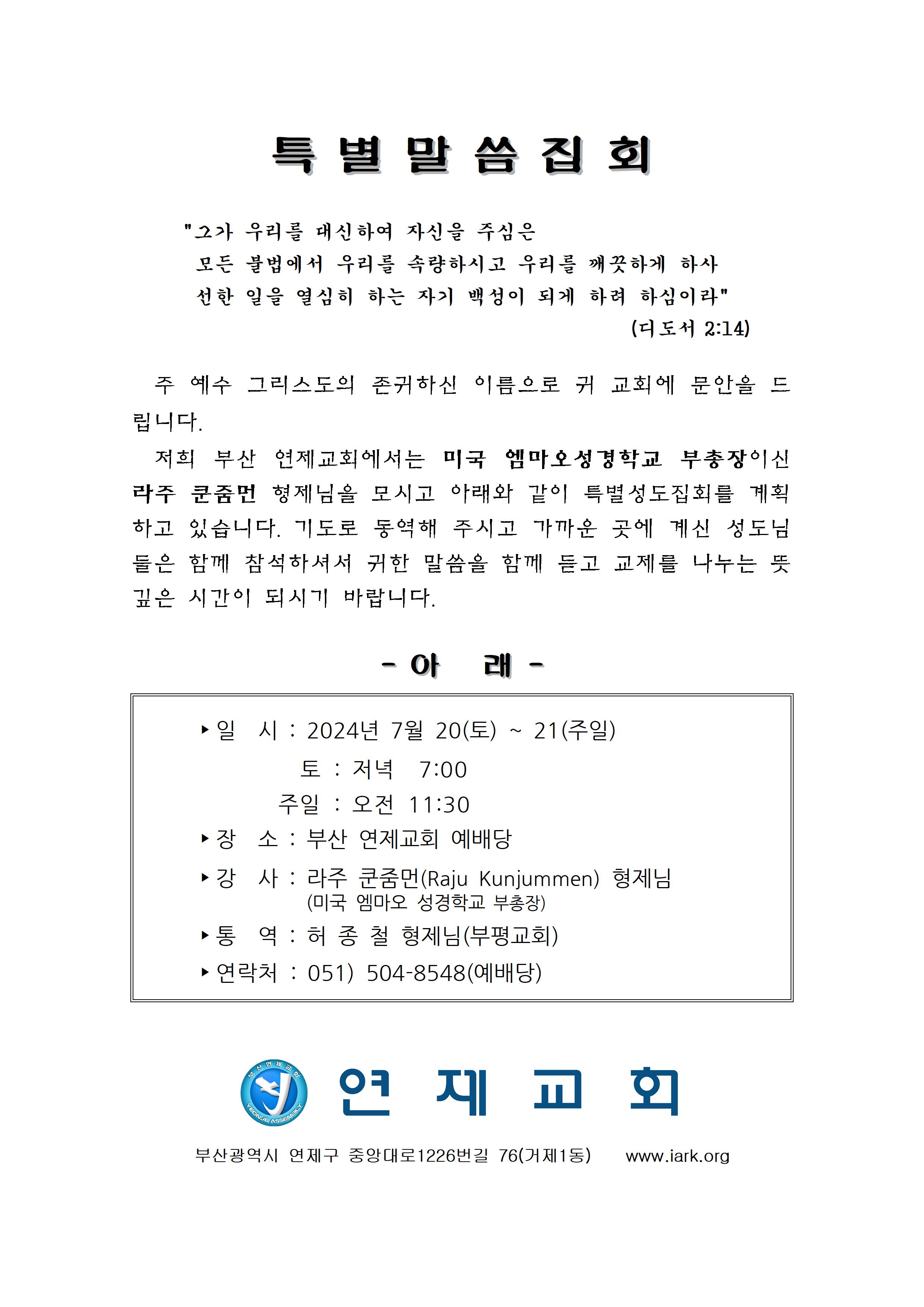 [성도집회] 부산연제교회 말씀집회 7.20~21 (라주 쿤줌먼)