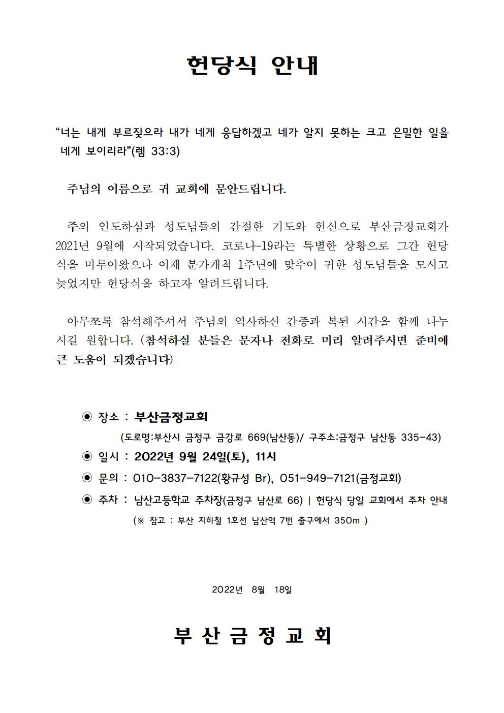 [지역교회] 부산금정교회 헌당식 안내 (일시 : 2022년 9월 24일)