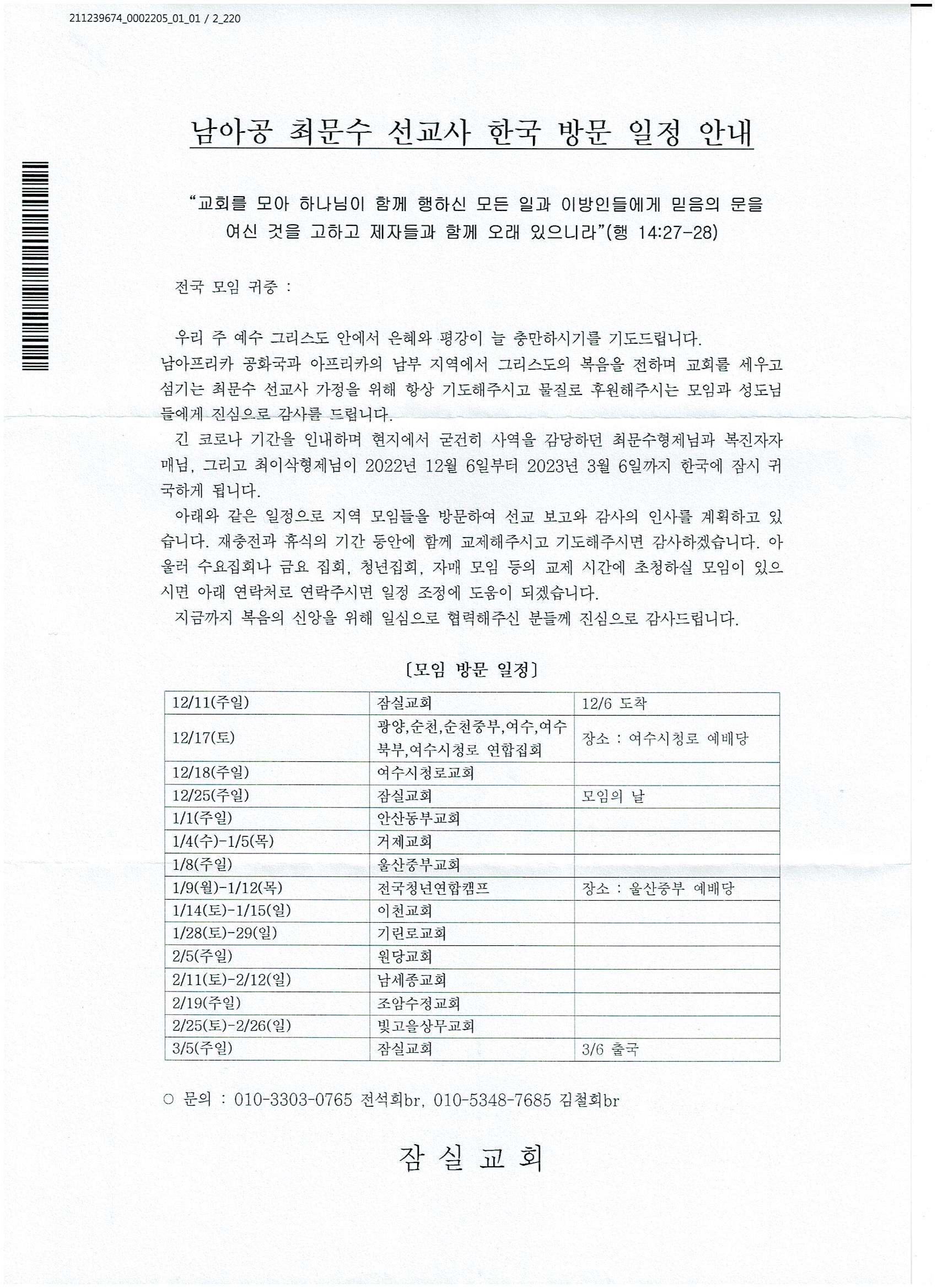 [선교] 최문수선교사 순회말씀집회 (12월 11-3월 5일)