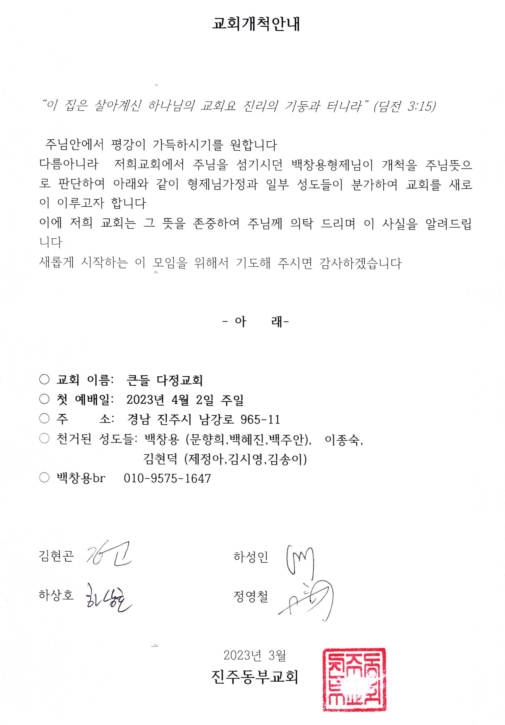 [지역교회] 큰들다정교회 개척소식(23.4.2)