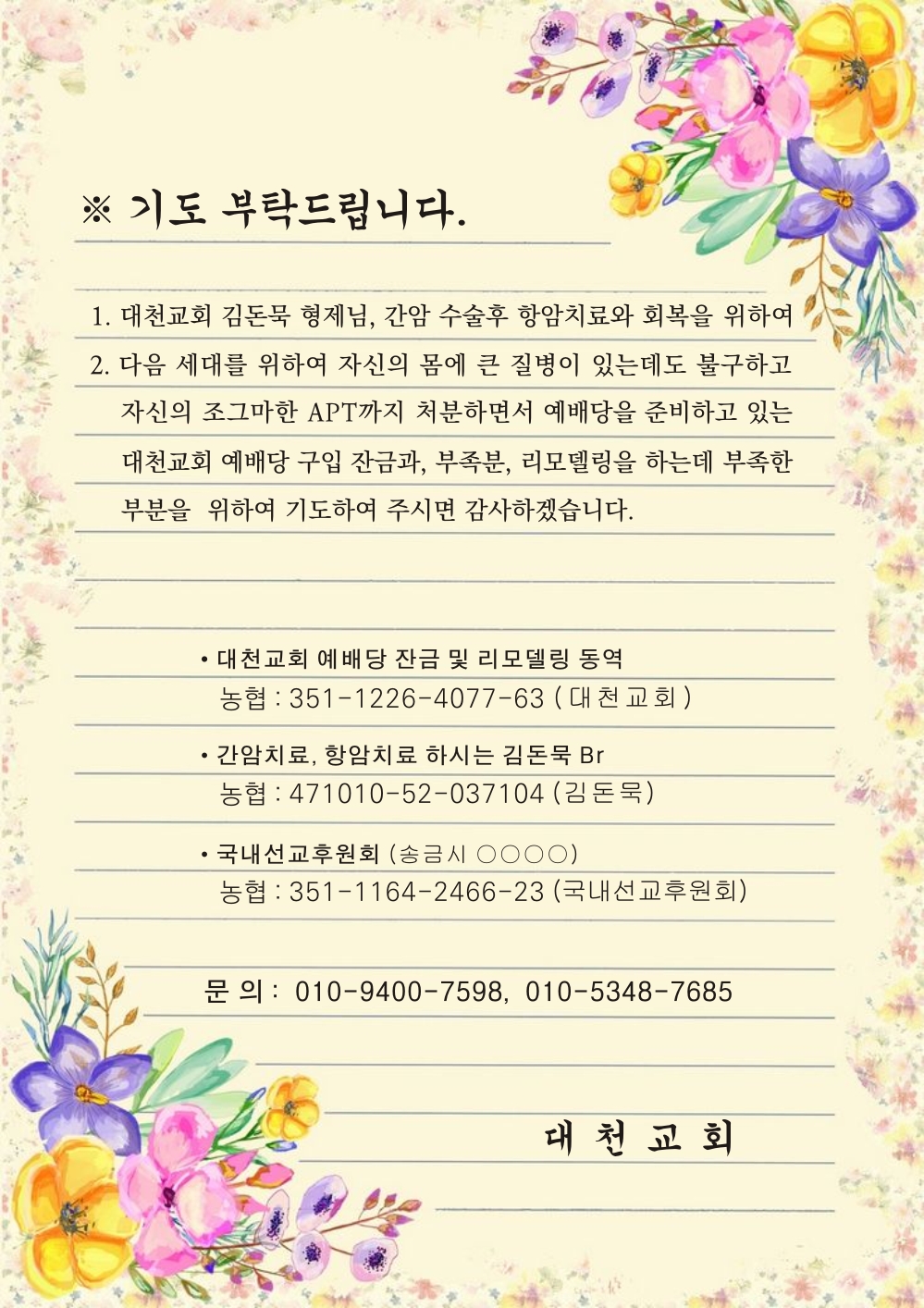 [지역교회] 대천교회 리모델링 진행상황 및 형제님 투병 근황 안내