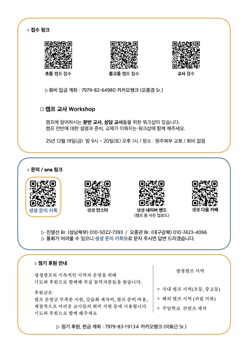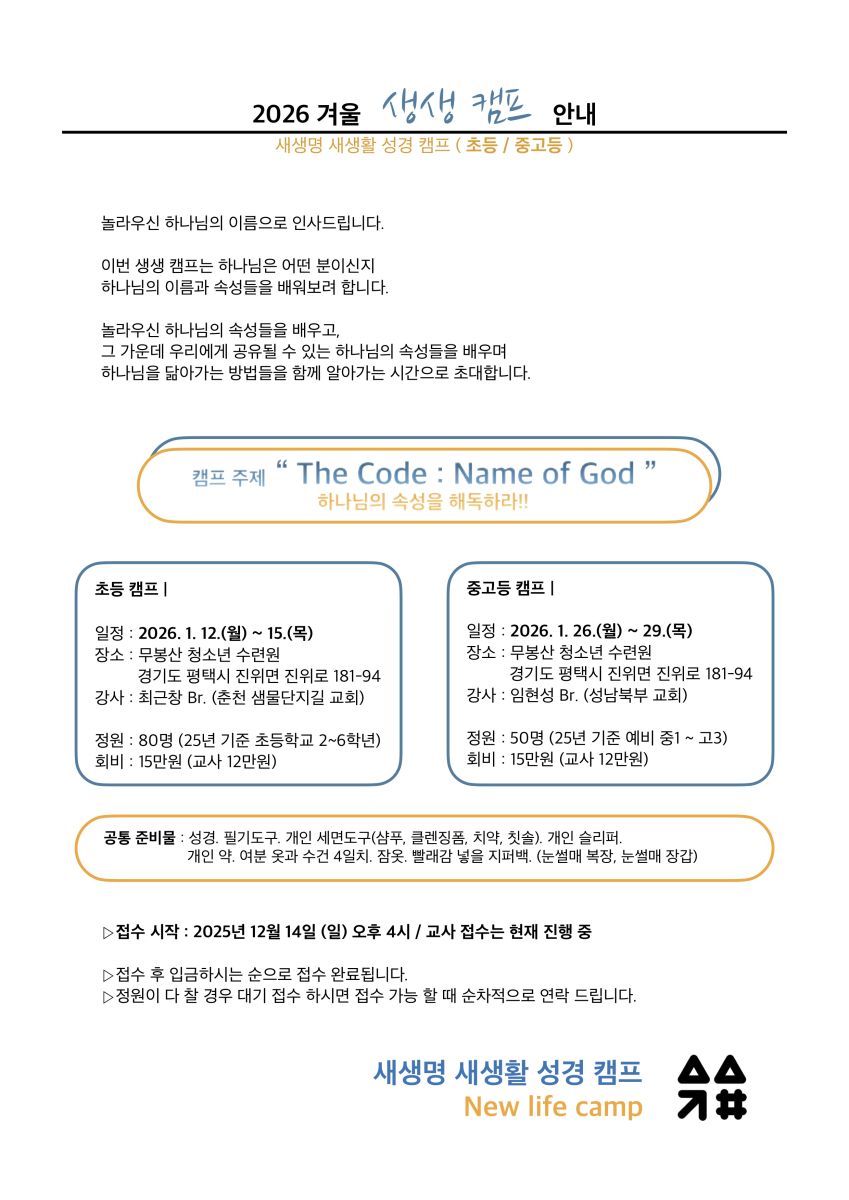 [캠프와 수련회] 2026 겨울 생생캠프 (초등 / 중고등) 안내
