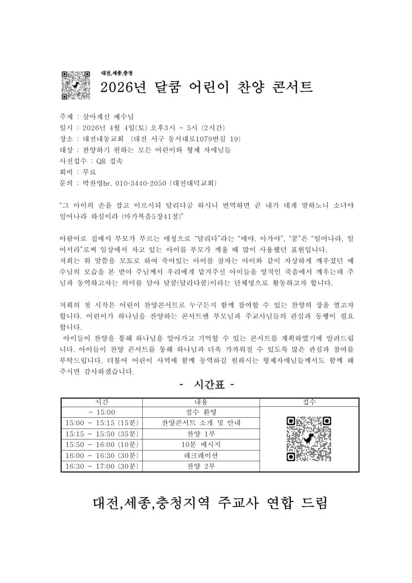 [강습과 세미나] 달쿰 어린이 찬양 콘서트_충청지역 (4월 4일)