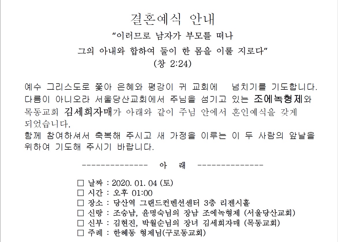 [기쁜소식] 조에녹형제 ♥ 김세희자매(01월04일)