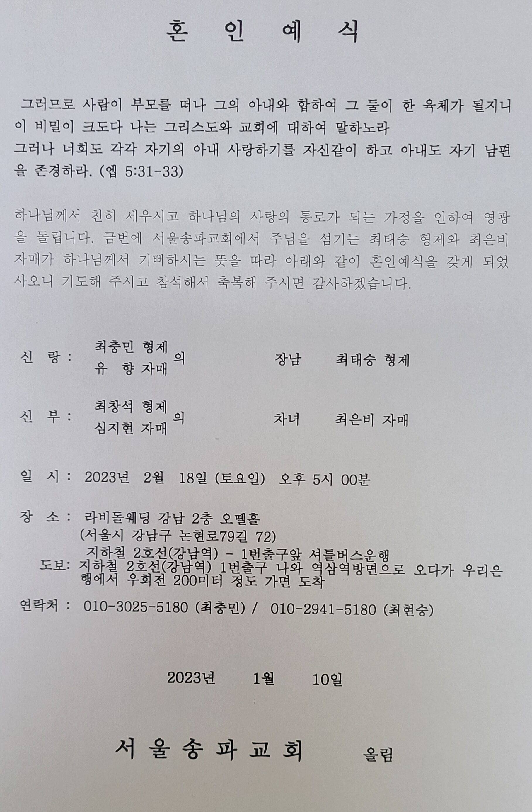 신랑 : 최태승br (송파교회)-최충민br, 유향sr의 자