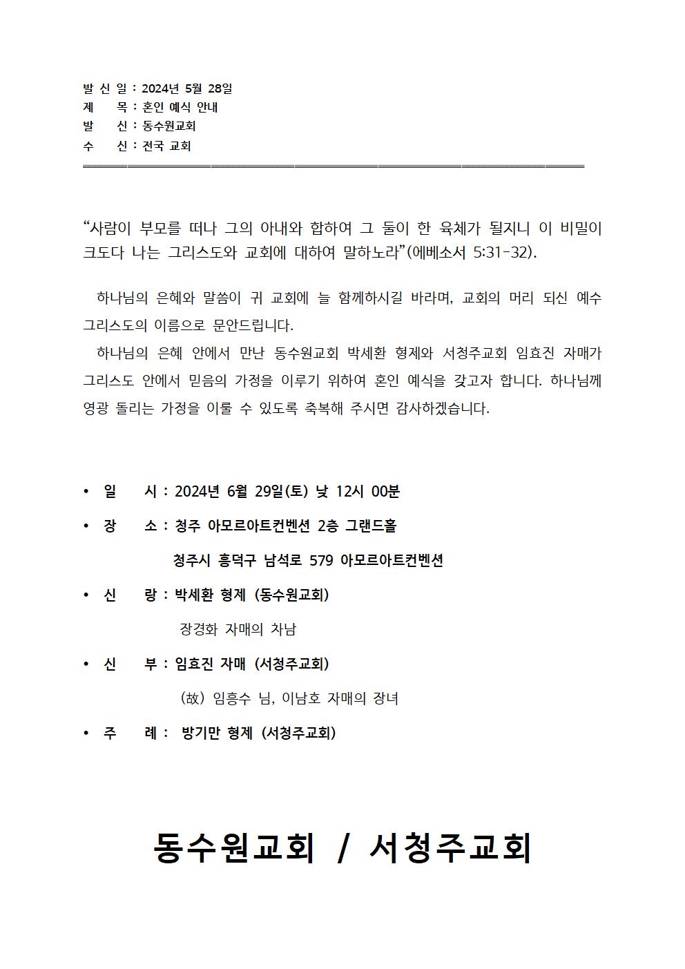 [기쁜소식] 박세환 형제, 임효진 자매(6월 29일) 결혼