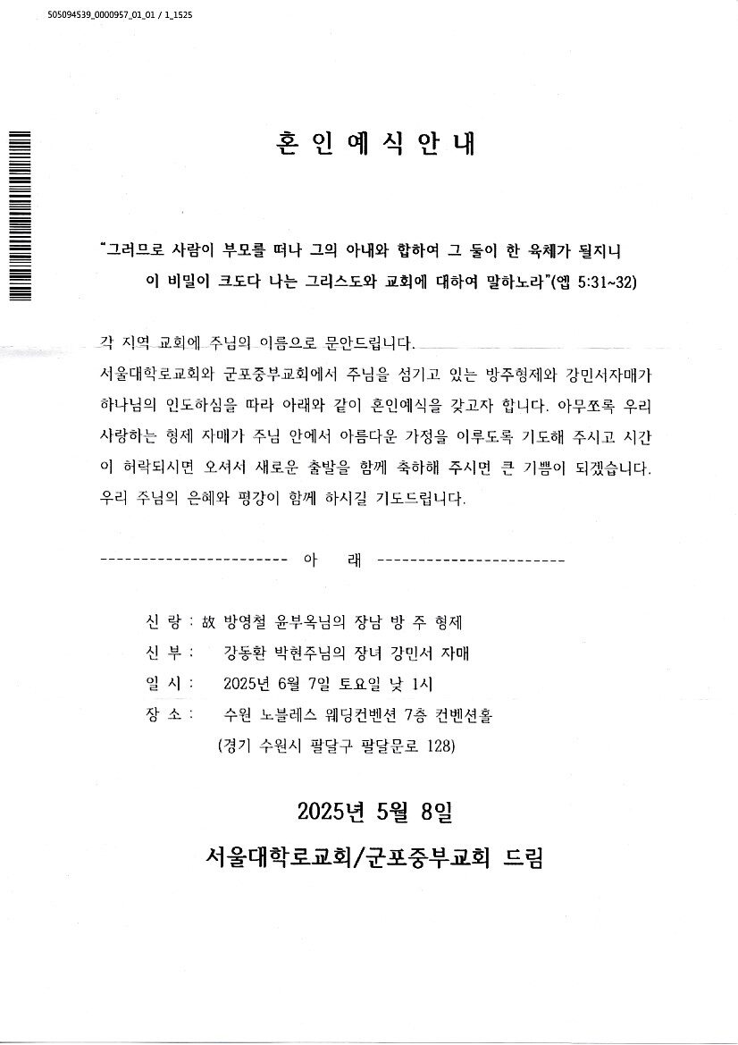 [기쁜소식] 방주형제, 강민서자매 (6월 7일)