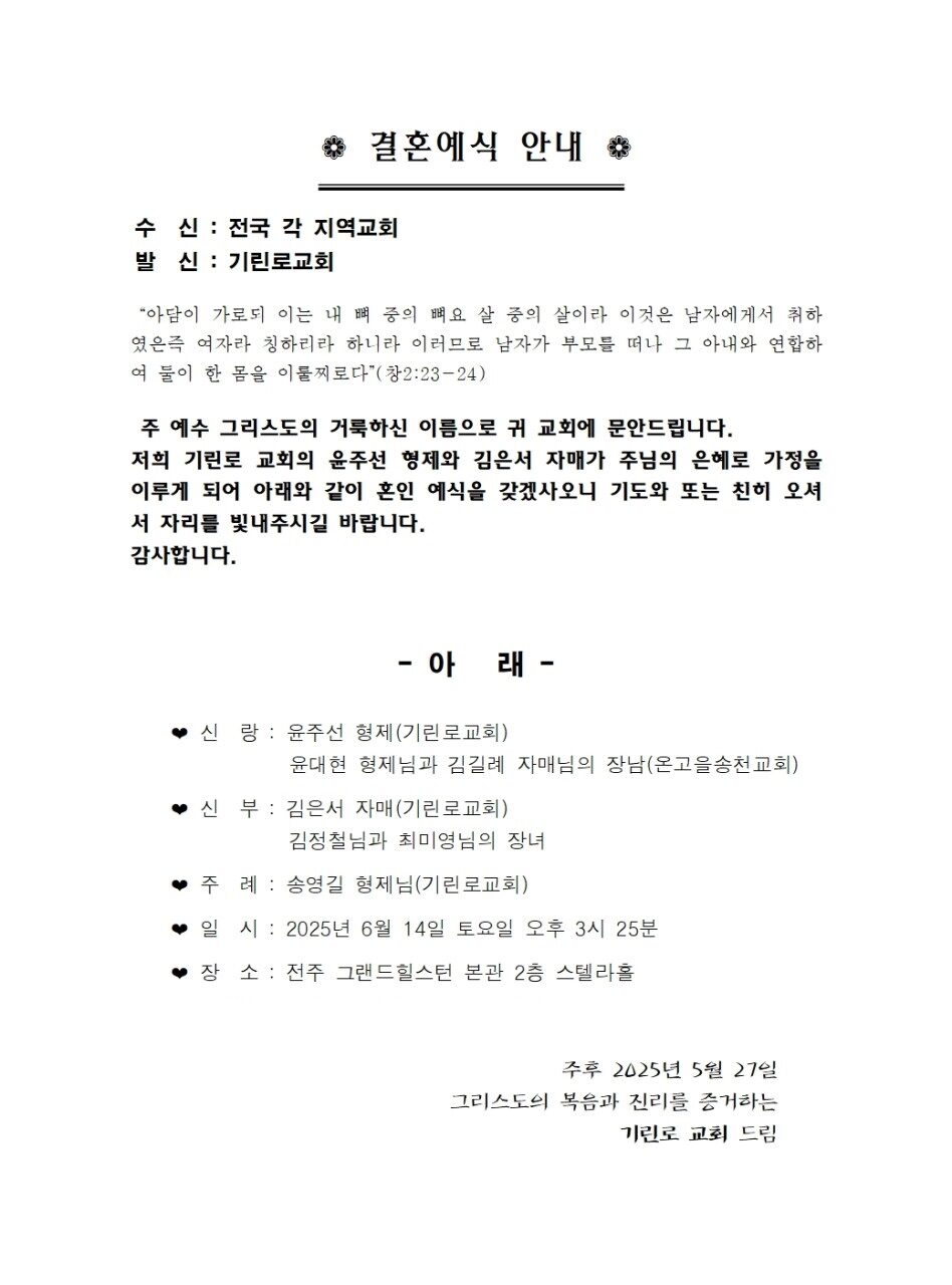 [기쁜소식] 윤주선형제. 김은서자매 (6월 14일)