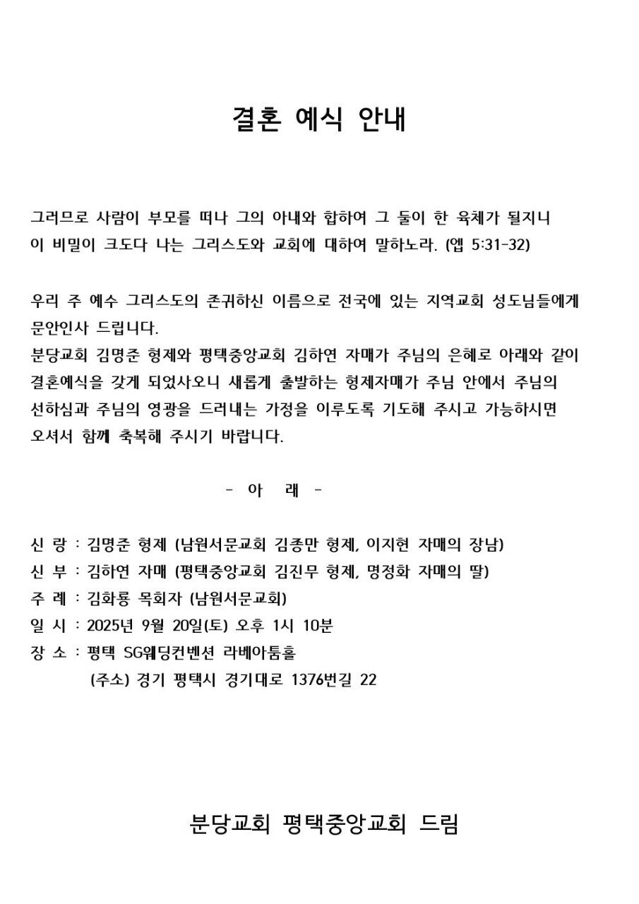 [기쁜소식] 김명준형제, 김하연자매 (9월 20일)