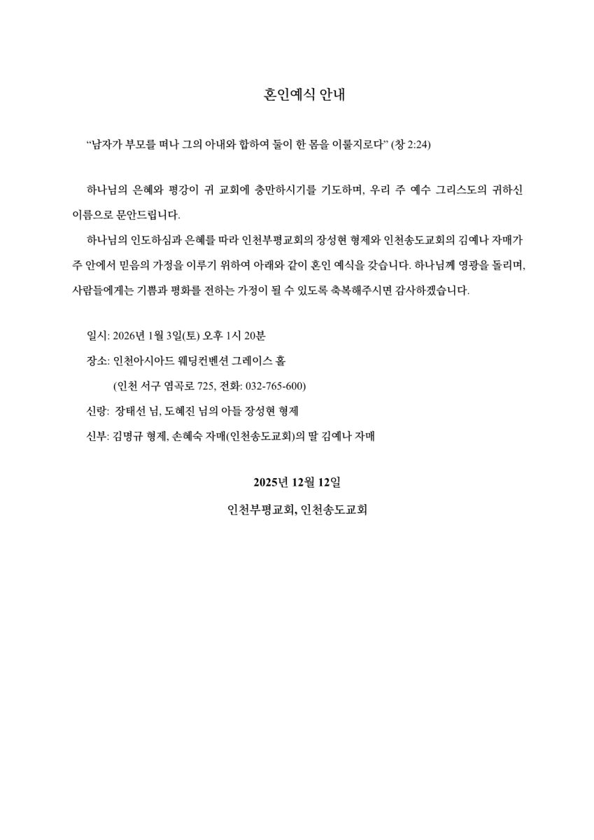 [기쁜소식] 장성현형제, 김예나자매 (1월 3일)