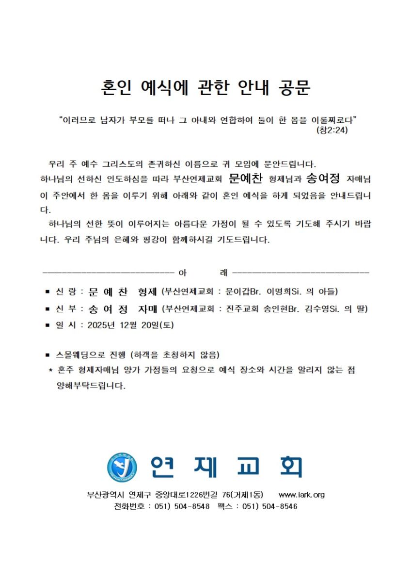 [기쁜소식] 문예찬형제, 송여정자매 (12월 20일)
