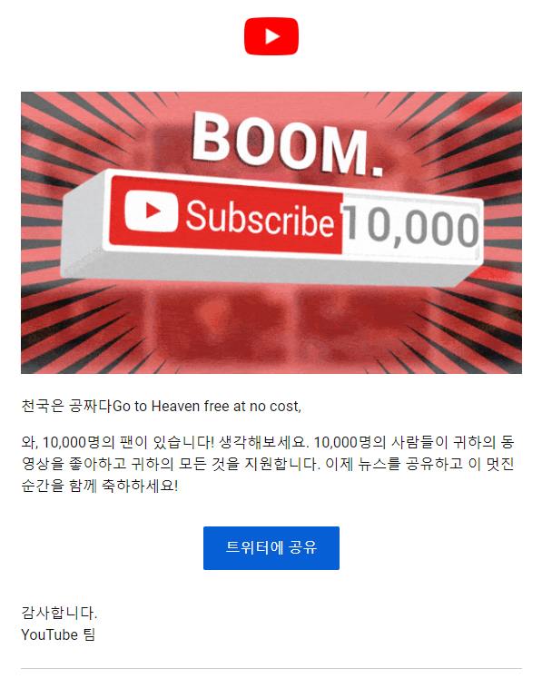천국은 공짜다 채널이 유튜브로부터 구독자 1만명 달성 축하를 받았습니다.