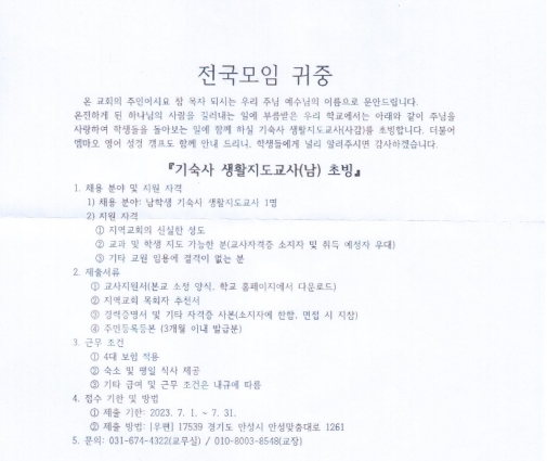 [구인] 디모데학교 기숙사 생활지도교사(남) 초빙