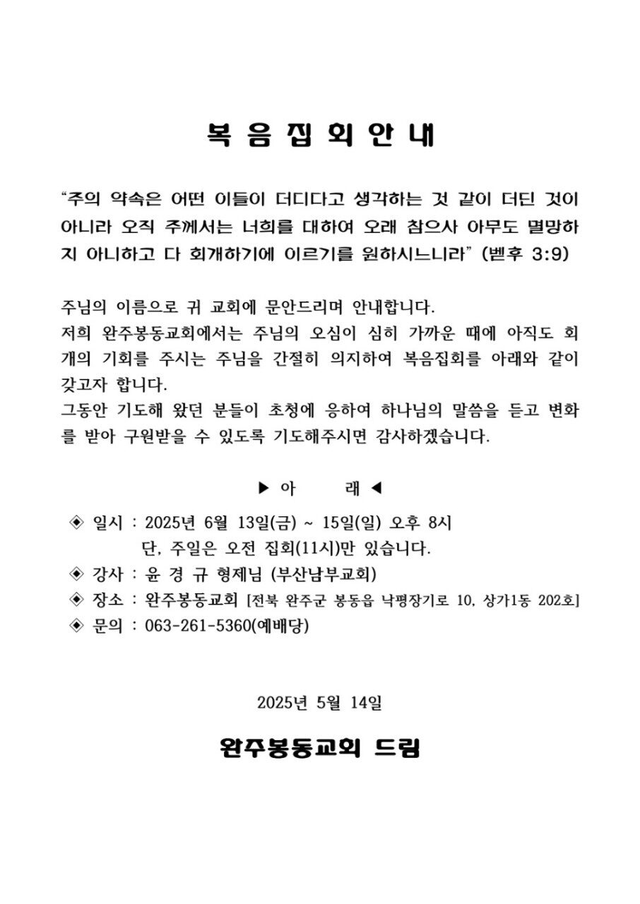 [복음집회] 완주봉동교회 (6월 13-15일)