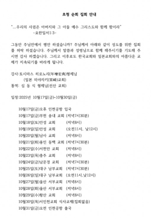 [특별집회] 토시마스 히로노리br 순회집회 (10월 17-30일)