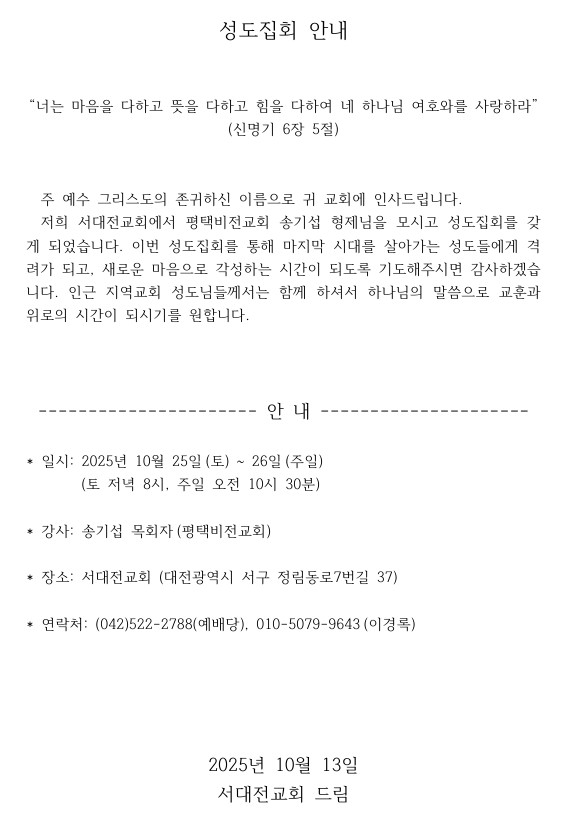 [성도집회] 서대전교회 (10월 25-26일)