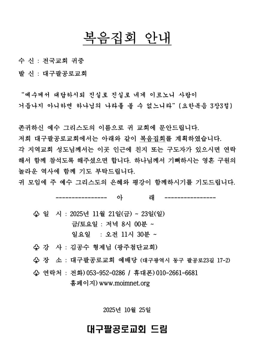 [복음집회] 대구팔공로교회 (11월 21-23일)