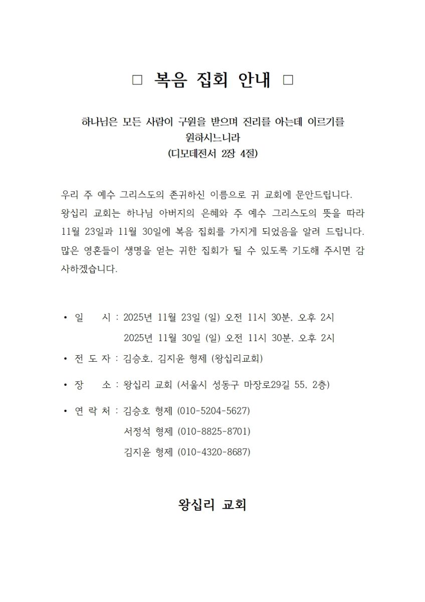 [복음집회] 왕십리교회 (11월 23일, 30일)