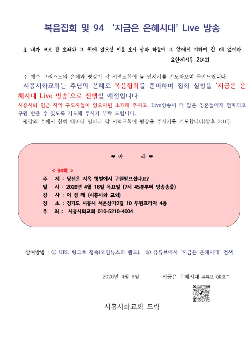 [복음집회] 복음집회 및 94회 ‘지금은 은혜시대’ Live 방송
