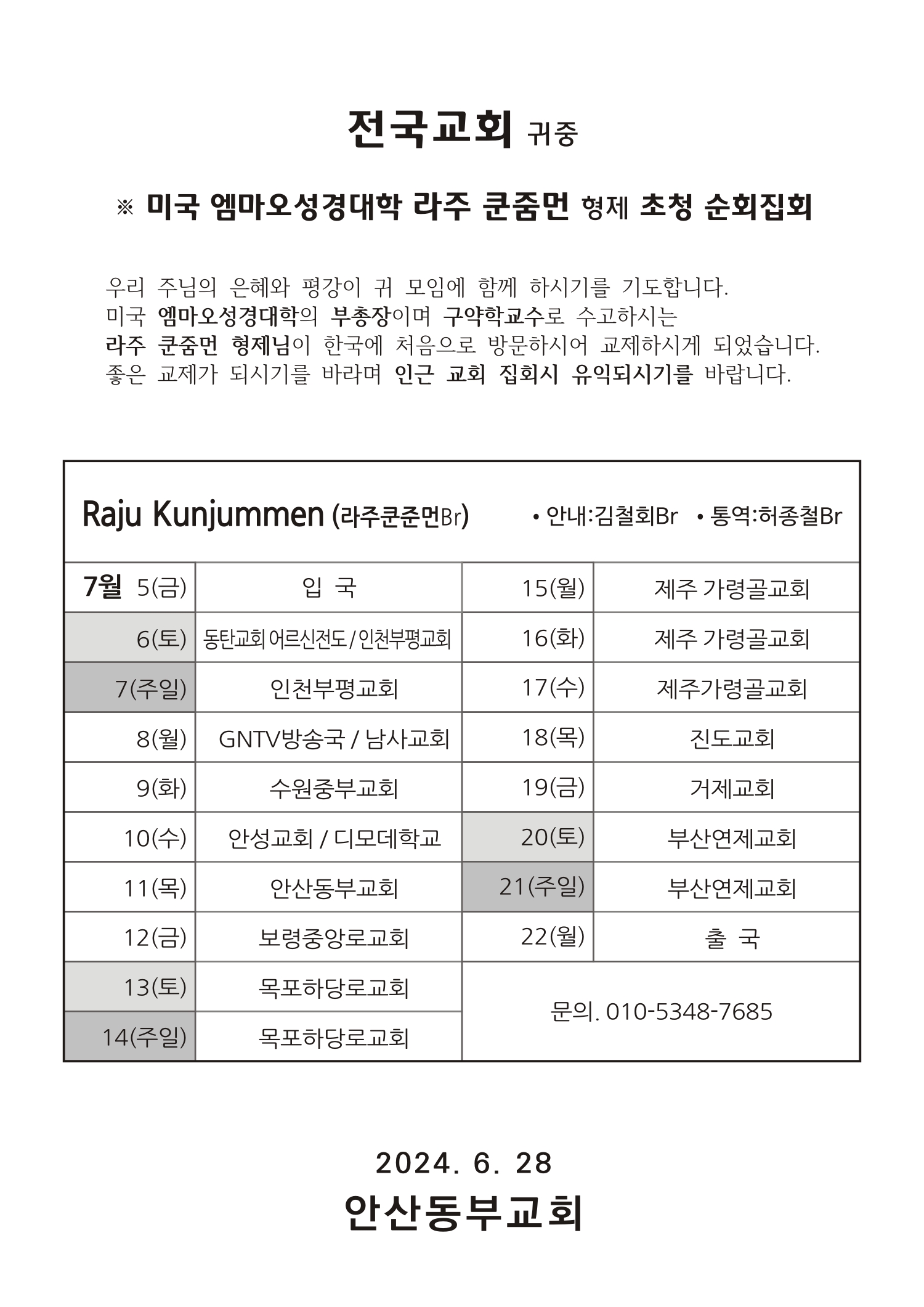 [특별집회] 라주 쿤줌먼 형제님(7.6~22)초청집회 안내