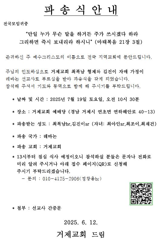 [선교] 거제교회 레바논 선교사 파송식 안내(최복남br, 김진이sr) - 7/19토