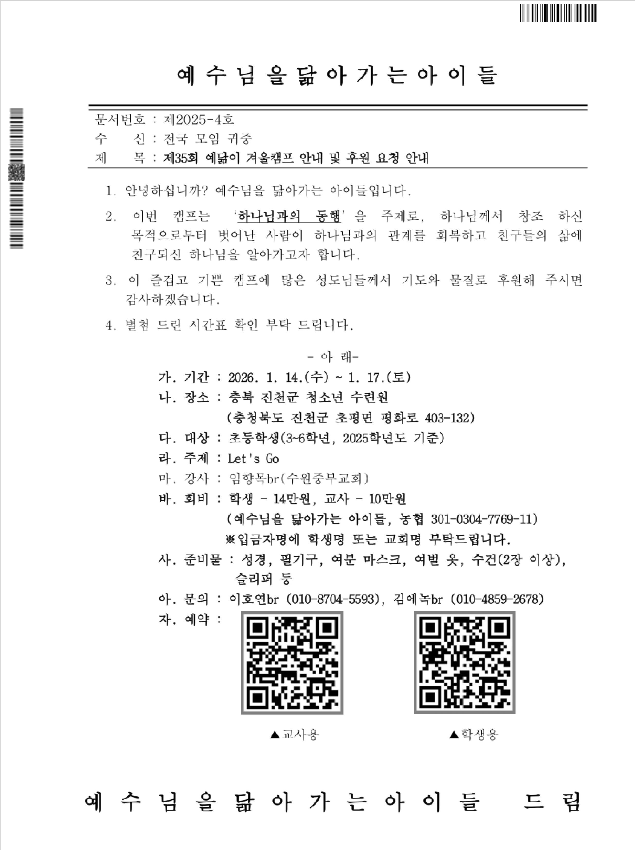 - 회비 : 어린이 14만 원 / 교사 10만 원 [농협, 301-0304-7769-11(예수님을 닮아가는 아이들)]