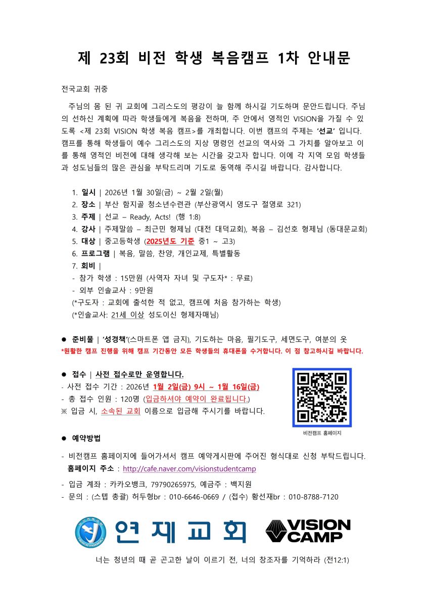 [캠프와 수련회] 제 23회 비전 학생 복음캠프 1차 안내문
