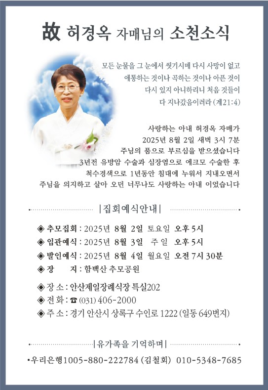 [소천소식] 안산동부교회 허경옥자매님(8월2일)소천소식
